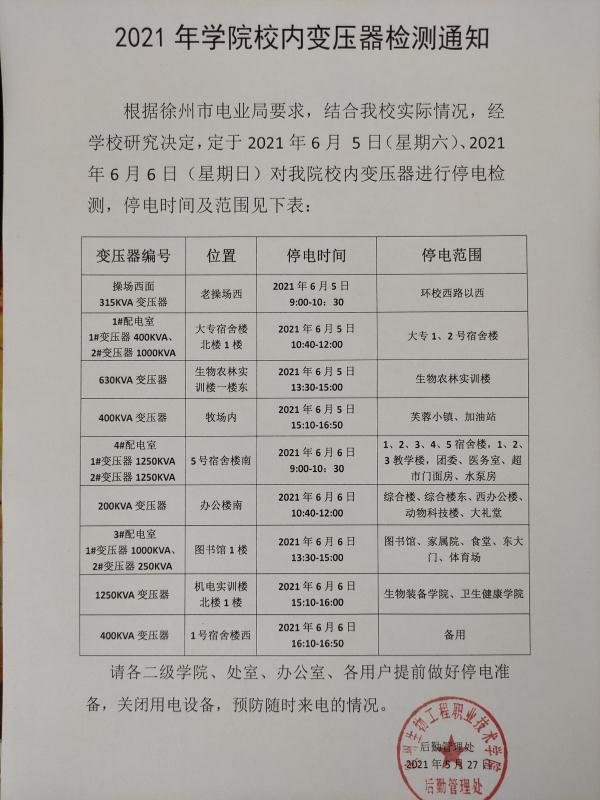为了保障全院教学、生活、学习、工作顺利进行,后勤处按照年度工作计划于6月5日6日分别对全院所有变压器进行了检测、维护。确保了全院安全用电。