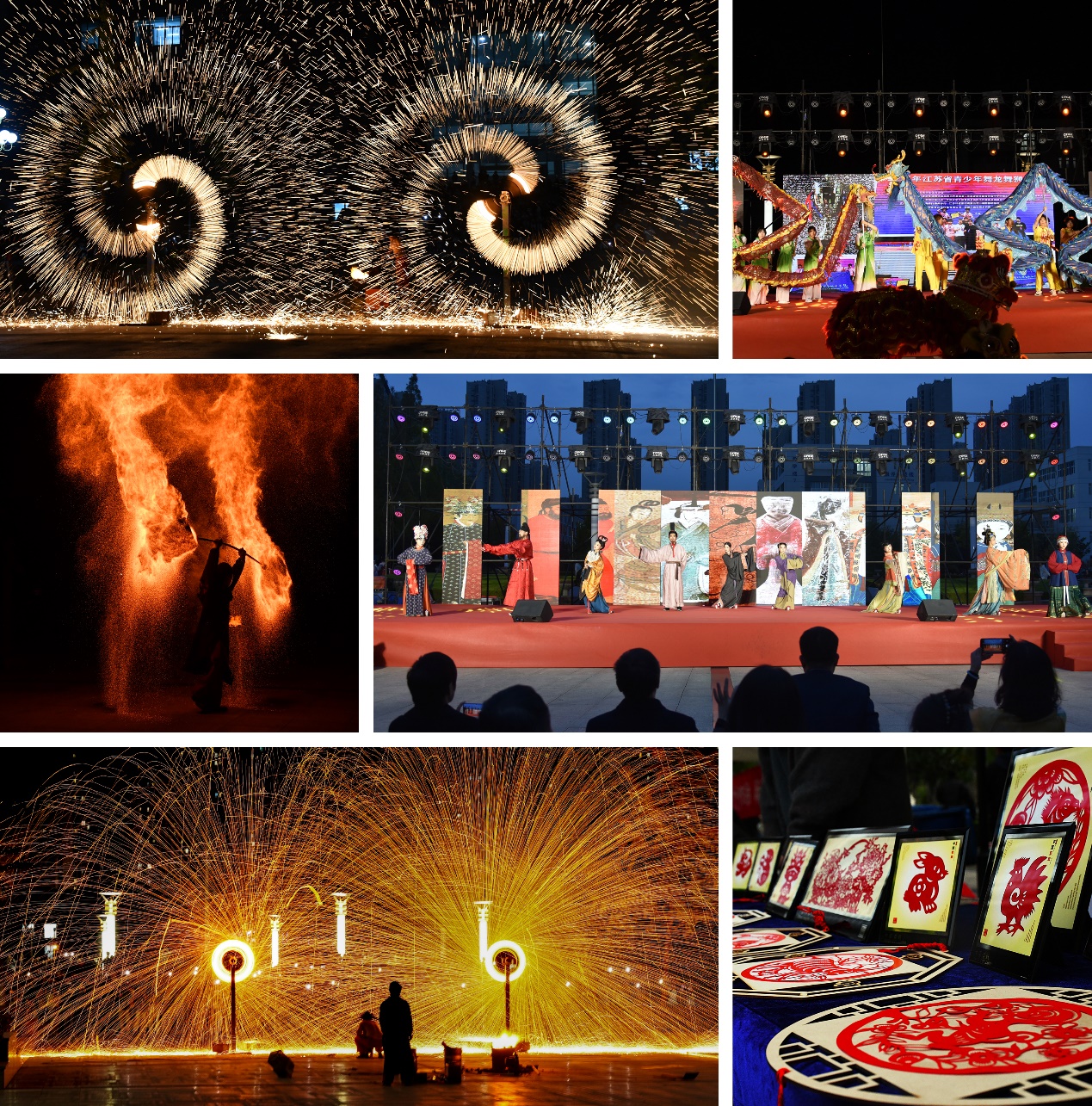 活动现场热闹非凡。非遗产品展区,徐州剪纸、香包制作、糖画等非遗项目的传承人现场展示技艺,师生们纷纷驻足观看,亲手体验制作过程,感受传统手工艺的独特魅力;美食区香气四溢,把子肉、米线、二中烤肉筋、老彭城烤面筋等特色美食吸引了大批师生排队品尝,大家一边品尝美味,一边聆听美食背后的历史故事,在味蕾的享受中触摸徐州文化的温度。文艺展演区,以打铁花、变脸、汉服等非遗表演为亮点,铁花在夜空中勾勒出绚丽的图案,照亮了整个校园。一张张色彩斑斓的脸谱瞬间变换,让人目不暇接。汉服衣袂翩跹,舞姿优雅,尽显古典韵味与文化之美。